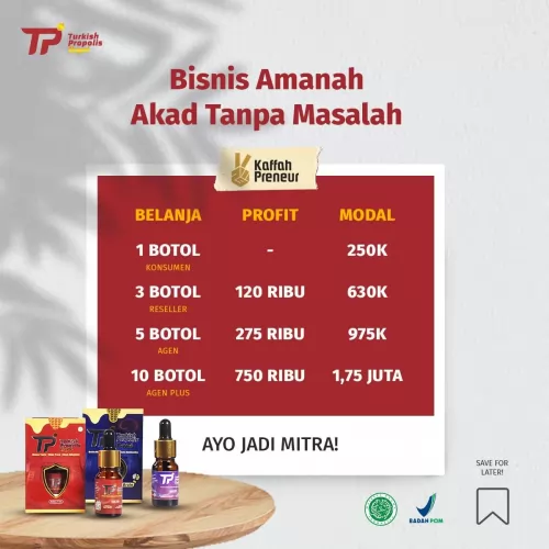 Keuntungan Menjanjikan: Dengan menjadi agen, Anda dapat menikmati margin keuntungan yang tinggi. Turkish Propolis Ruqyah memiliki repeat order yang tinggi, sehingga potensi pendapatan Anda akan terus meningkat.